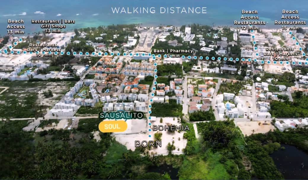 Our building is part of the Sausalito / SOUL complex, located just off the main road. Simply walk north along the dotted path shown on the map, and you’ll reach banks, restaurants, and beach access points without the need for taxis or cars.